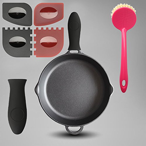 SIX IN ONE SET: The cast iron cleaning brush set contains 1 silicone handle holder, 2 plastic scrapers for flat and 2 scrapers for curved areas, and 1 scrub brush. The whole set provide you a magical experience in easy cleaning, seasoning and cooking.