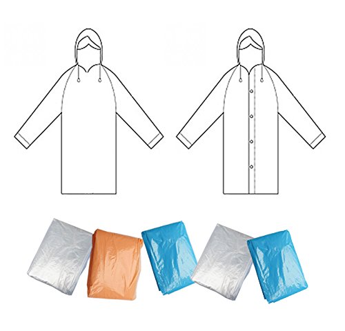 - HOODED DRAWSTRING RAIN PONCHO WITH SLEEVES - The hood that you can adjust with the drawstring is a nice touch, keeping your hair and face dry. Sleeve ends make the rain water does not get in. The emergency raincoat set includes 3 Hood poncho style in blue, transparency,orange colors and 2 thick snap button style in blue and transparency colors. The snap button closures are very secure.The snaps were tight and the hood was large