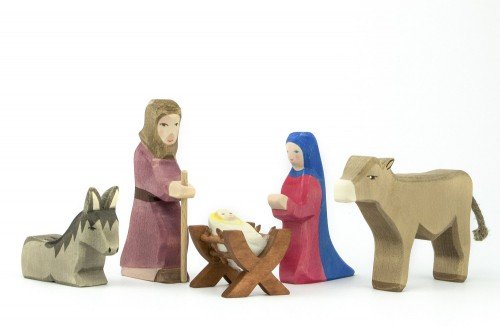 beinhaltet: Maria (H 11,5cm), Josef (H 16cm), Krippe mit Kind (H 7cm), Ochse (H 7cm) und Esel (H 9cm)