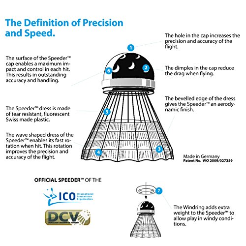 Compared to conventional shuttlecocks the Speeder is smaller and heavier. This allows a game over long distances, regardless of wind and weather.