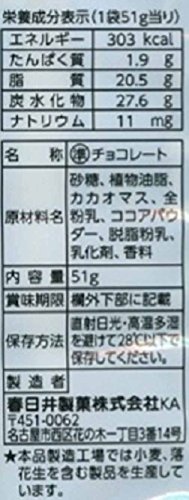 原材料:砂糖、植物油脂、カカオマス、全粉乳、ココアパウダー、脱脂粉乳、乳化剤、香料