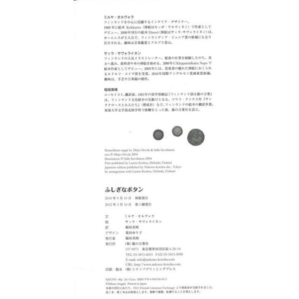 【商品基本情報】 商品名称:ふしぎなボタン 著者/出版社:ミルヤ・オルヴォラ猫の言葉社/ミルヤ・オルヴォラ猫の言葉社 初版発行日:2010/09/10 サイズ:B5変判 ページ数:40 ISBN/JAN:9784904196052/4528189570580