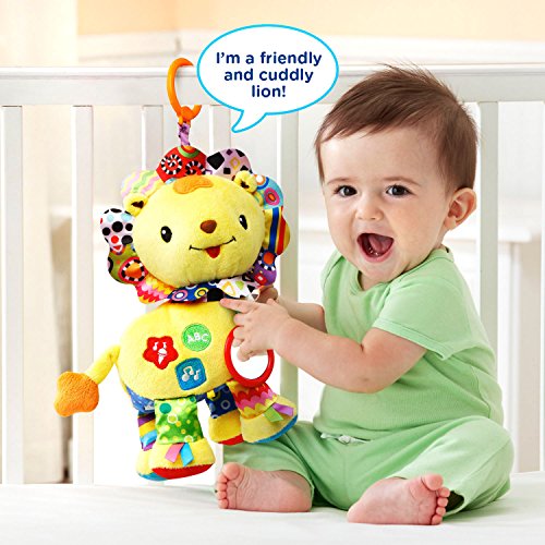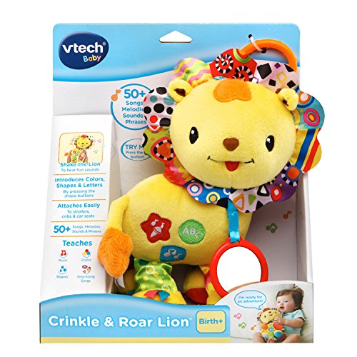 Shake, explore and sing with the Crinkle and Roar Lion by VTech. Press the colorful shape buttons on the lion's side to learn shapes, colors and letters. Shake the adorable lion to activate the motion sensor and hear him roar and play other cheerful sounds. Your little one will love the crinkly feet, ribbon tags and textured rings. The lion also includes a baby-safe mirror to build self awareness. It's also the perfect take-along toy and can be attached to carriers, strollers and more. Explore and learn with the playful Crinkle and Roar Lion! The baby toy is intended for babies from birth to 3 years. The musical toy requires 2 AAA batteries (batteries included for demo purposes only; new batteries recommended for regular use).Feature