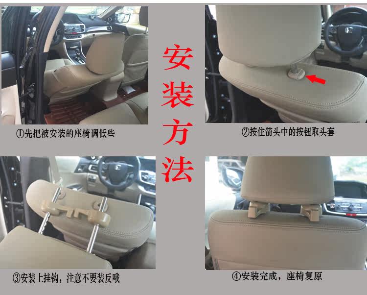 安装方法:按压头枕升降按钮,取出头枕,拿出挂钩套进头枕杆,装回头枕,安装完毕。