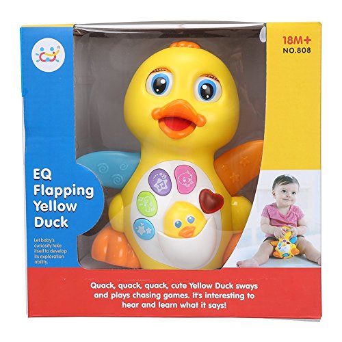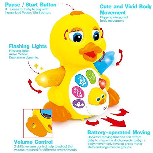 This dancing duck toy will keep you and your child entertained with fun sing-along tunes, wings flapping, eyes blinking, and mouth opening and closing. All of the sounds it makes are adjustable to mute, low and regular. The bright colors are fun and appealing. Make play time a fun time. NEW PRODUCT WITH FACTORY PACKAGING FEATURES: Bump and Go Action, Wings flap and light up when music begins. Direct from the manufacturer. 3AA batteries required but NOT included. 1- has 4 color buttons on stomach a - first button- picture of a star - makes different duck sounds b - 2nd button - pictures of a duck with musical notes - plays 2 different tunes c- 3rd button- picture of star with musical notes - plays another 3 tunes d - 4th button- picture of a duck - says uh oh 2- Has a red heart on stomach - when pressed it makes the sound of a beating heart 3- Has a little duck in the stomach - when pushed down it says "quack quack" 4- when the hair on the head is pushed down the duck dances around while: a- flapping its arms - which keep lighting up b - opening and closing its eyes c - moving its mouth opens and closed d - the hearts light keeps light upFeature