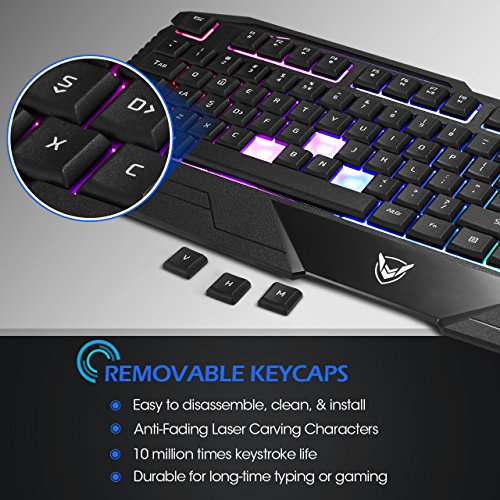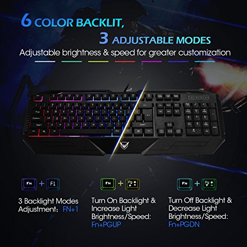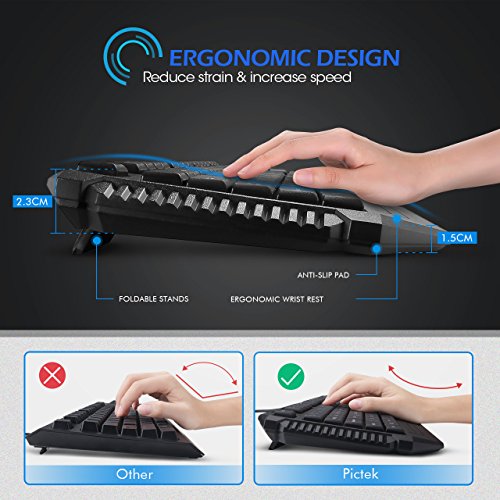 Always lose games for slow speed & inaccurate keyboard? Annoyed about hand fatigue after endless hours of professional-level gaming? Want to have an eye-catching gaming experience at dark night? PICTEK wired gaming keyboard, the perfect companion for gaming players, what you get is not just a keyboard but a truly unique gaming experience adjustable backlight effect 1. Turn on/off the backlight or change the backlight effect: Fn+1 2.Adjust backlight brightness: Fn + pgup / fn + pgdn 3.Adjust light running speed: Fn+ ← and → lock win key support windows lock by pressing fn+win to prevent accidental game interruptions. Low noise ultra-thin keyboard creates minimum noise and amazing feel without sacrificing performance. It provides a comfortable, quiet typing experience for you even you use it at night. Anti-slip design anti-slip pads under the keyboard keep keyboard in place for better gaming experience. Removable keycaps all keycaps can be removed for cleaning, easily keep your keyboard clean and tidy. Water-resistant multiple drain holes in the base can deal with accidental splash water or sweat, so you no need to worry about pouring water or coffee accidently. Specification: Key number: 104 keys anti-ghosting: 19 keys operating force: 50±5g key stroke travel: 2mm switch durability: 10 million clicks net weight: 29 ounce size: 18.3*7.6*1.2 inch. Package included: 1 x 104-key wired gaming keyboard with usb cable 1 x user manual warranty : 12-month worry-free guarantee.Feature