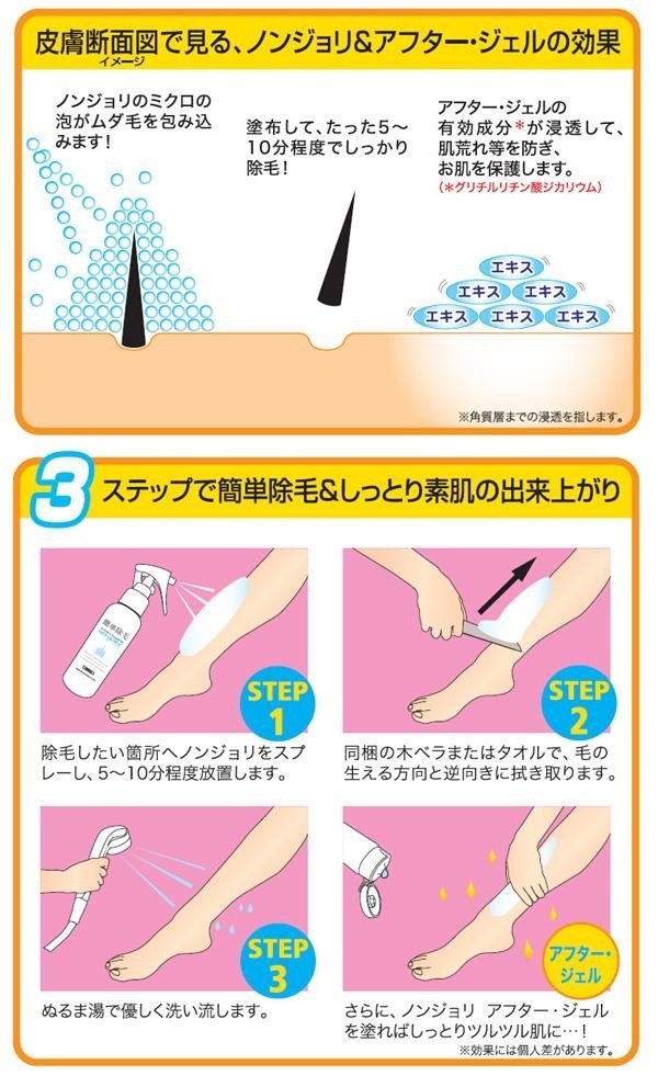 【ご使用方法】 STEP1.除毛したい箇所へノンジョリをスプレーし、5~10分程度放置します。 STEP2.同梱の木べらまたはタオルで、毛の生える方向と逆向きに拭き取ります。 STEP3.ぬるま湯で優しく洗い流します。 ☆AFTER☆さらに、ノンジョリ・アフター・ジェル(別売)を塗ればしっとりツルツル肌に!(※効果には個人差があります。)