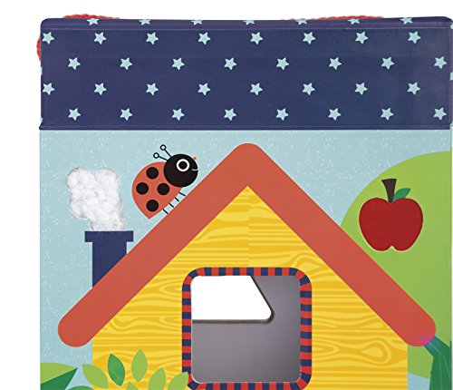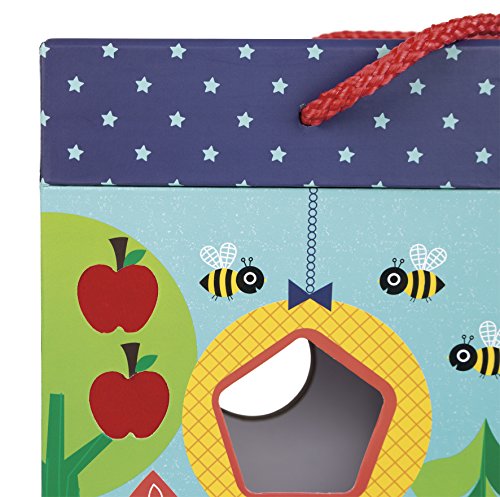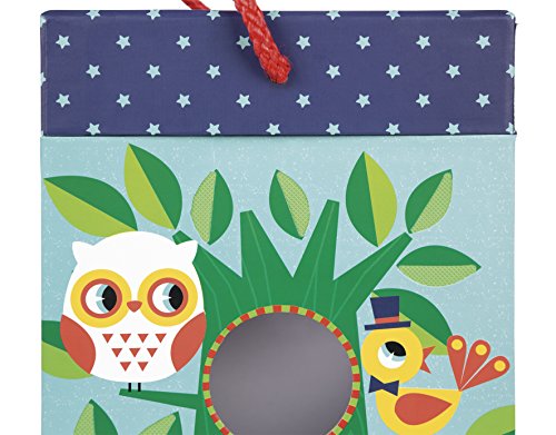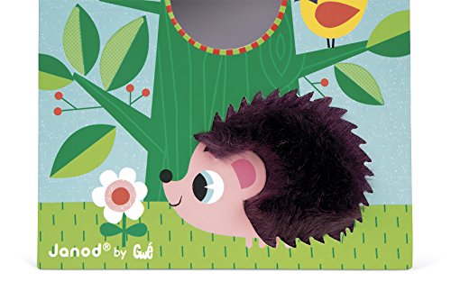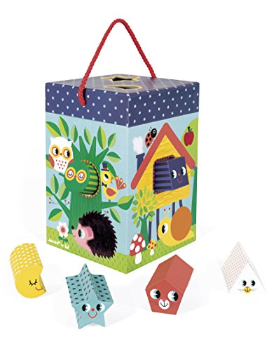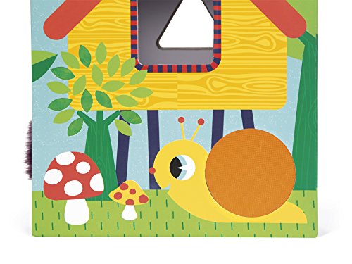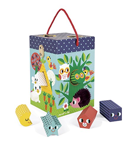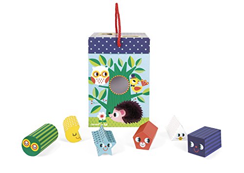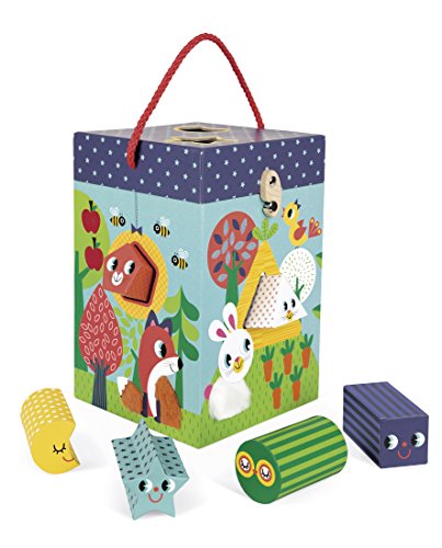 Janod garden textures shape sorter is a cute and colorful way to learn! the adorable and durable thick cardboard box features a garden scene with critters who are textured and has 6 holes in different shapes. Your little backyard Explorer can touch the animals and insects as well as sort shapes all day. The box measures 9in tall by 5.75in wide by 6in deep, hinges open at the top with a rope handle and a metal and wooden hook to close it. The cardboard shapes are all about 1.5in wide by 1.5in. Long by 2.75in deep. Recommended for children 1 to 3 years of age.Feature