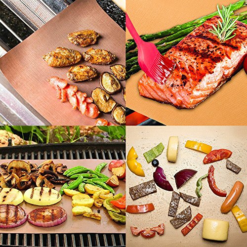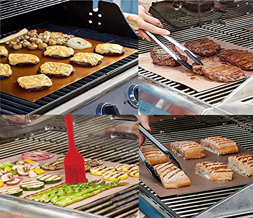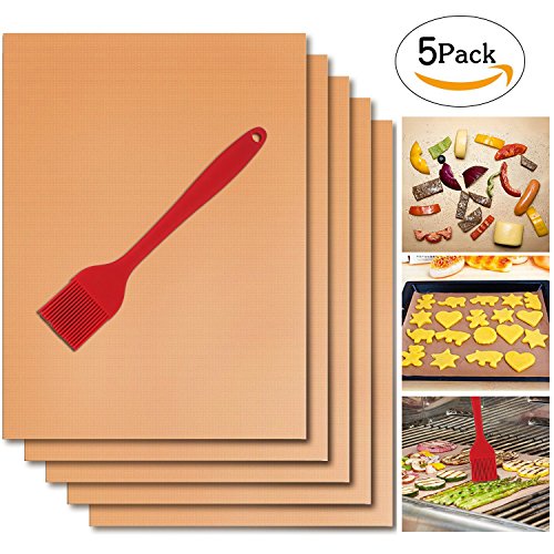 Copper Grill Mat Set of 5 with one Red Silicone Brush, Teflon Fiber BBQ Grill & Baking Mats, Non-stick, Reusable, Easy to Clean and Store - 15.75x13.00Inches