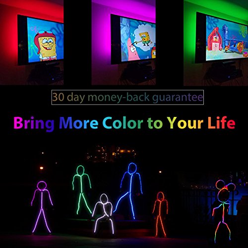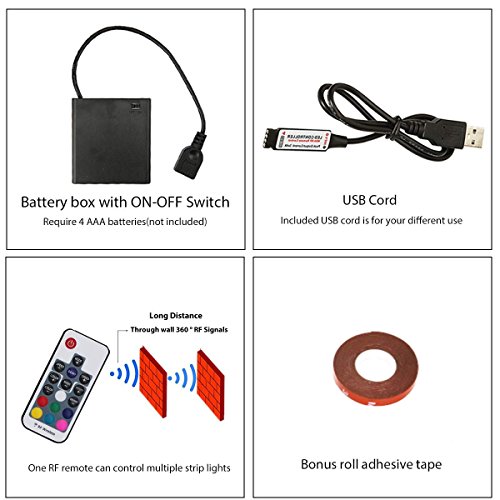 - Battery Operated Led Lights with Extra USB Cord: RGB LED strip lights kit powered by 4 AA batteries (NOT Included). No need extra AC or DC power.Also can be powered with your USB adapter,power bank,PC for longer time use, perfect for computer light,led HDTV backlight, accent lighting, patio lighting, auto lighting, ambient lighting,neon lighting and more.