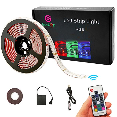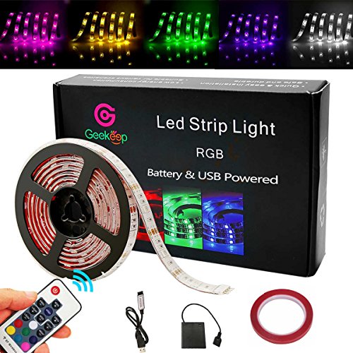 Battery Powered Led Strip Lights, Geekeep Waterproof RGB Led Strip Rope Lights with Remote,USB Cord and Bonus Roll Adhesive Tape (2m/6.56ft)