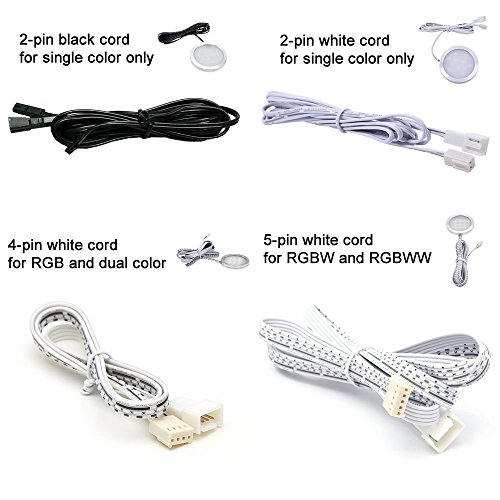 Working with 5-pin white cord RGBW/RGBWW Color Changing LED Under cabinet puck lights. Specifications Please Note: This extension cable is specifically used for Aiboo RGBW/RGBWW Color Changing LED under cabinet puck lights.