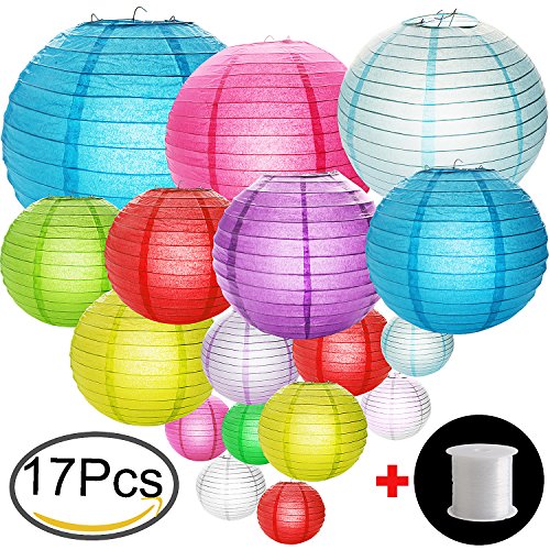 Paper Lanterns Decorative Set, Outee 17PCS Blue Paper Lanterns Pink Paper Lanterns Assorted Colors with a Fishing Line for Wedding Christmas Party Decorations