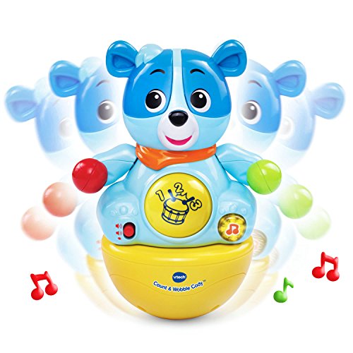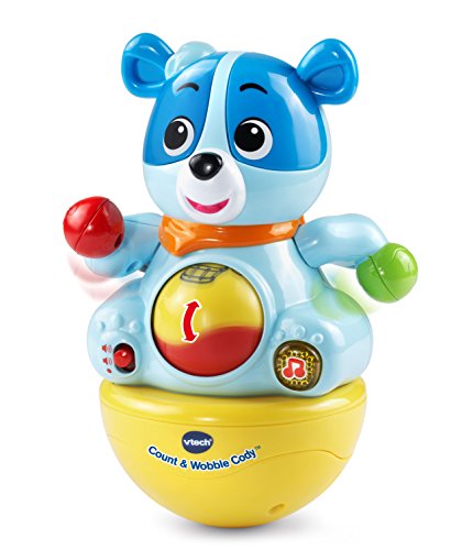 Watch Cody rock and play silly sounds with the Count & Wobble Cody by VTech. Give him a little push, and this wobbling toy sways and shakes his maracas while playing music while he wobbles. Little ones can also learn about numbers and instruments while building motor skill by rolling the ball in Cody's tummy. Your child will have a rocking good time with Cody The Smart Cub!.