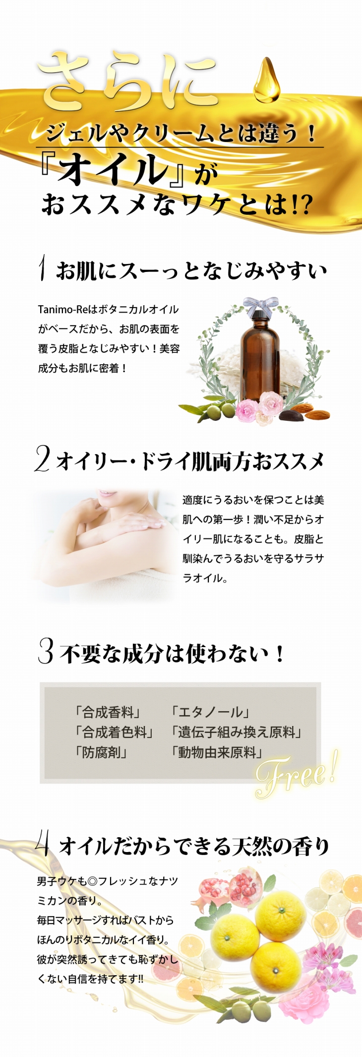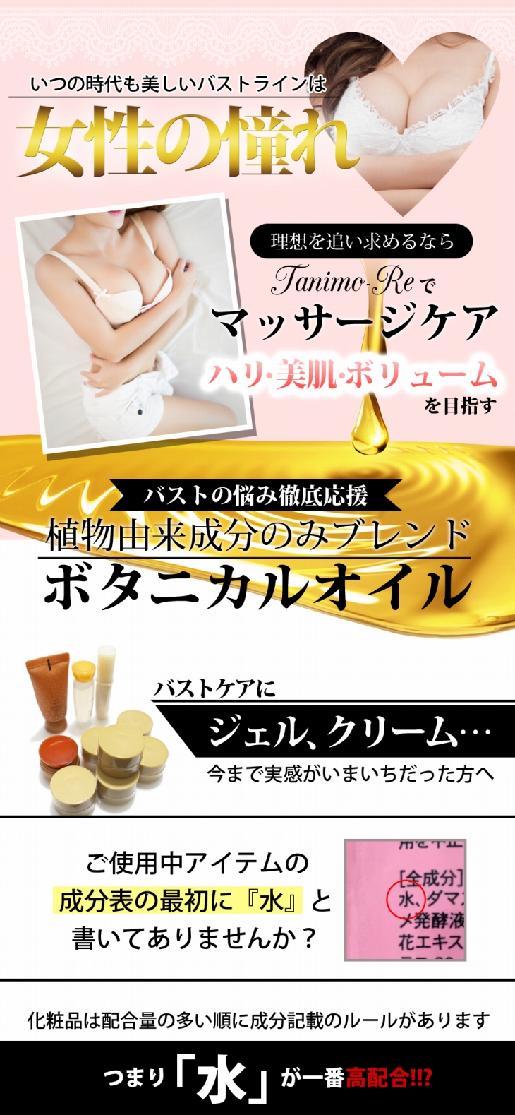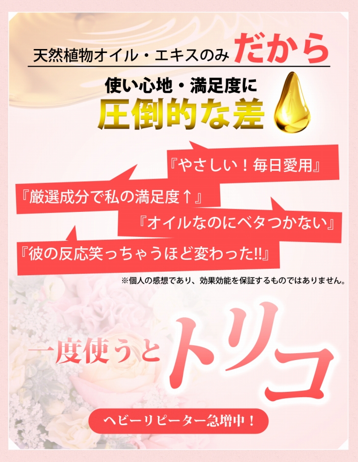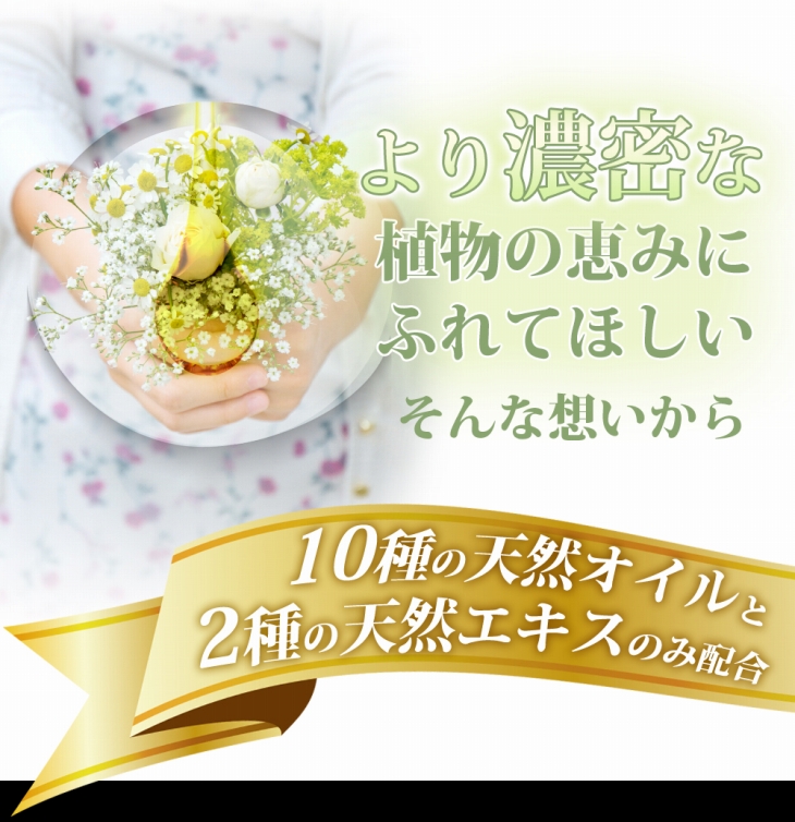| 全成分 | コメ胚芽油、ホホバ油、オリーブ油、アーモンド油、ローズヒップ油、ゼラニウム油、ウイキョウ油、オニサルビア油、ナツミカン花油、プエラリアミリフィカ根エキス、ザクロ種子油、シャクヤク根エキス |
