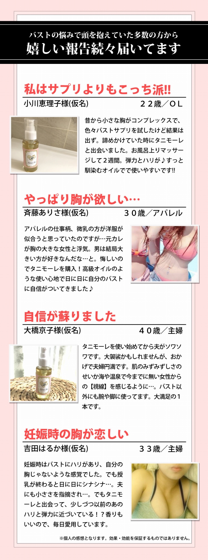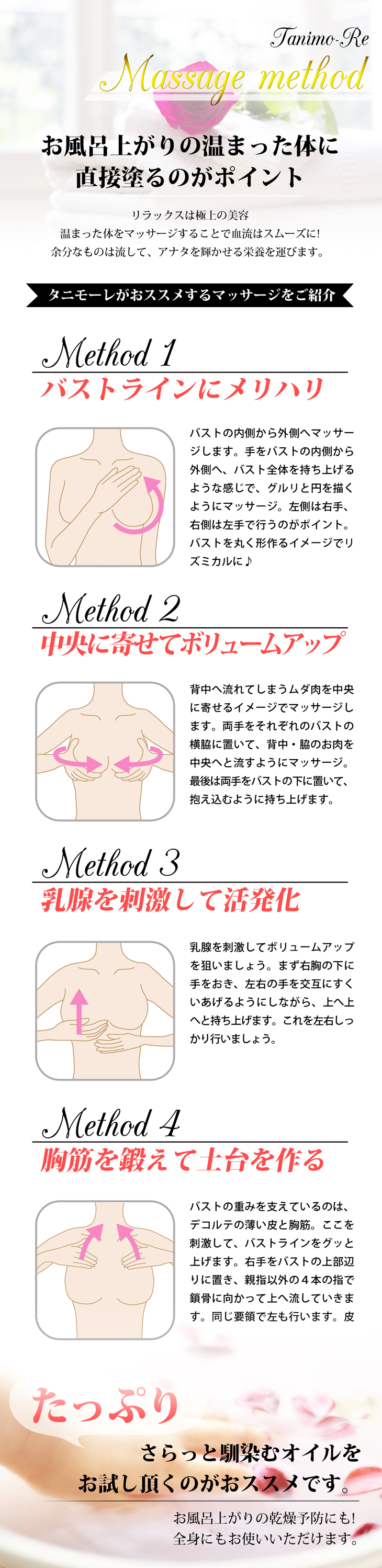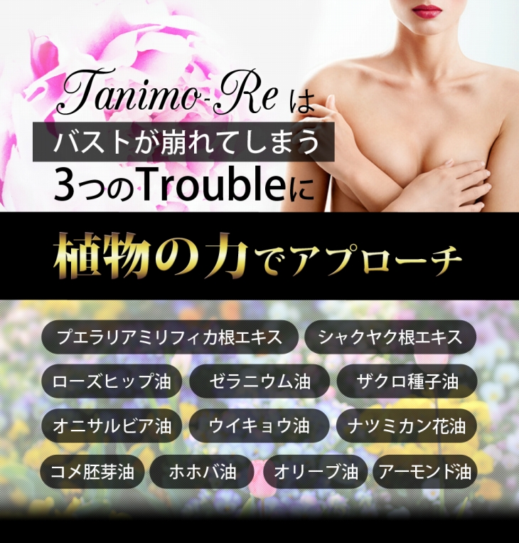 | 全成分 | コメ胚芽油、ホホバ油、オリーブ油、アーモンド油、ローズヒップ油、ゼラニウム油、ウイキョウ油、オニサルビア油、ナツミカン花油、プエラリアミリフィカ根エキス、ザクロ種子油、シャクヤク根エキス |