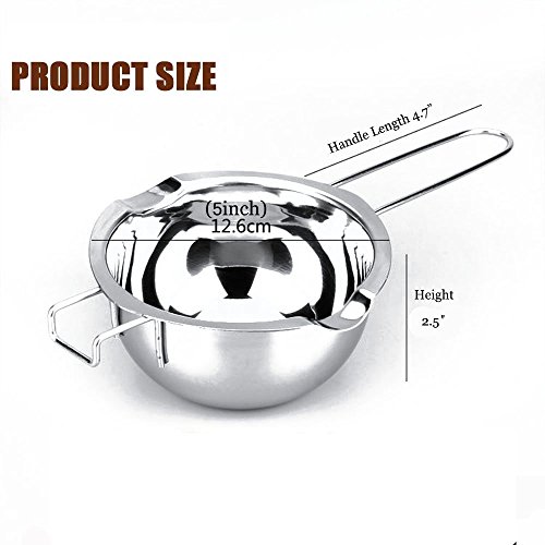 Studio : Easonove Publisher : Easonove Product Description Specification: Material: Stainles steel Color: Silver Size: Diameter5.2inch/13.2cm Handle 3.94 inch/10cm Hight 2.36inch/ 6cm Features: 1. HIGH GRADE MATERIAL, Stainles steel, Rust Resistant, Sturdy, More healthy 2. SUITABLE SIZE -- designed to perfectly fit sauce pans and smaller pots, ideal for steaming small amount of foods 3. Long Handle Design-- Stay cool strip handle, Front hook to prevent sliding away, Double pour spouts both sides, flat bottom 4. Wide range of use -- Perfect for melting butter, cheese, caramel, and chocolate, homemade cosmetics 5. EASY TO USE - Cook with gentle steam with this Endurance double boiler insert . Package Include: 1x Double Boiler