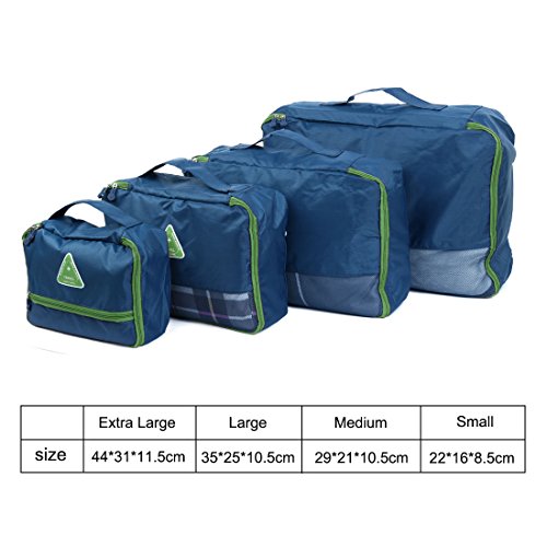 4 Packing Cubes: Extra Large (44*31*11.5cm) ,Large (35*25*10.5cm),Medium (29*21*10.5cm) ,Small (22*16*8.5cm)