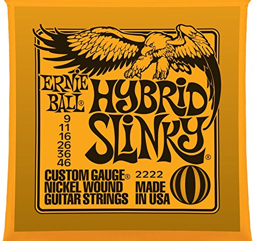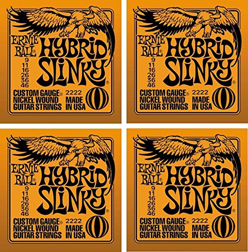 Studio : Ernie Ball Publisher : Ernie Ball Product Description Ernie Ball® Electric Guitar Strings, Nickel Wound, Hybrid Slinky (9-46), Model# 2222 4 Sets of Strings New Vacuum Sealed Ernie Ball® strings from your Authorized Ernie Ball® Dealer. Gauges: 9(E) - 11(B) - 16(G) - 26(D) - 36(A) - 46(E). Ernie Ball Hybrid Slinky Electric Strings are a perfect match for those who like the ability to combine our Super and Regular Slinkys. These strings are precision manufactured to the highest standards and most exacting specifications to ensure consistency, optimum performance, and long life. Hybrid Slinky wound strings are made from nickel plated steel wire wrapped around a hex shaped steel core wire. The plain strings are made of specially tempered tin plated high carbon steel; producing a well balanced tone for your guitar. Made in U.S.A. 0