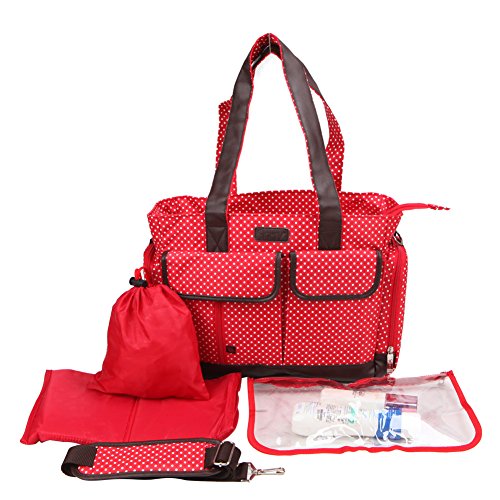6 piece diaper tote set includes: roomy mommy bag, string dirty cloth bag, diaper changing mat, clear PVC pouch, easy-open wipe case and detachable shoulder strap