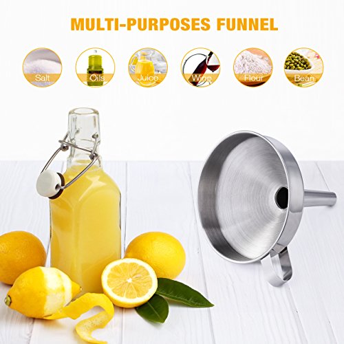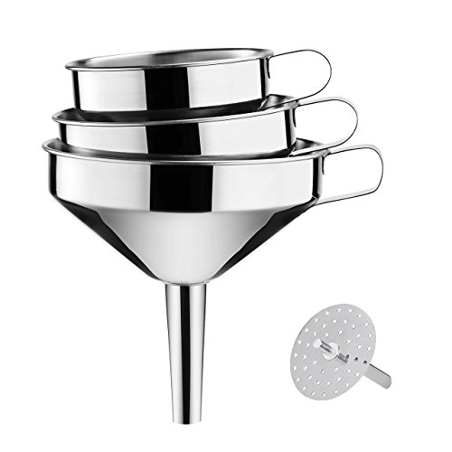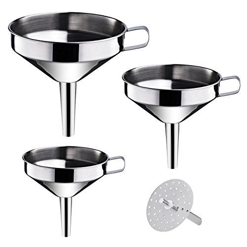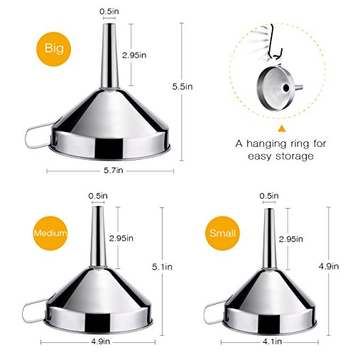 【STRAINER FUNNEL SET 】3 piece durable stainless steel funnels have the exact same spout sizes (0.5 ") and different width of the bowl (4.1", 4.9" , 5.7" ), are ideal for filling small bottles and containers while keeping the kitchen counter free from spills.
