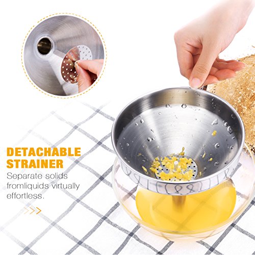 Stainless steel handle is convenient to hold the funnel over a jar, pot or pan, even easy to handle hot liquids. Now you can reuse cooking oil, infuse vinegar with herbs, even brew your own beer!