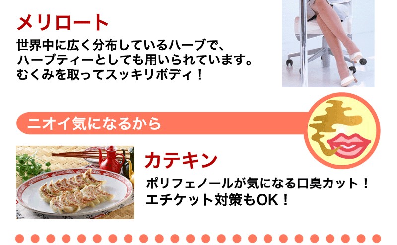 | 原材料名 | 白インゲン豆エキス、キダチアロエエキス末、α-リポ酸、L-カルニチンフマル酸塩、ハス葉エキス末、メリロートエキス末、サラシアレティキュラータエキス、デキストリン、 還元麦芽糖水飴、セルロース、ステアリン酸Ca、L-オルニチン、微粒酸化ケイ素、茶抽出物(カテキン含有)、ビタミンB1 |