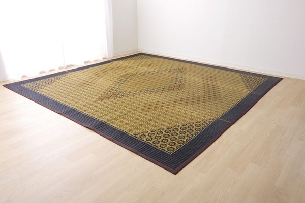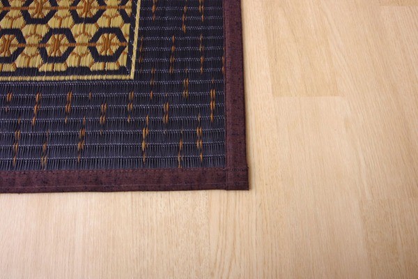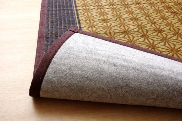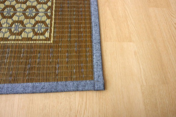 伝統工芸である組子のデザインをい草で表現したラグです。い草には空気の自然浄化作用、湿度の調節作用などがあります。ホットカーペットカバーとしても使用できます。い草に青森ヒバ加工を施しています。(抗菌、防臭効果)裏面には滑りにくい加工をした不織布を使用しているため、フローリングにも最適です。