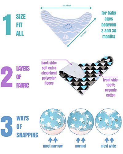 KEEP BABY’S CLOTHES CLEAN AND DRY: They successfully wick away moisture from drooling, teething, reflux, spit and food. Bandana bibs are exceptionally soft and comfortable because are made of 100% organic cotton on the front side and soft super absorbent polyester fleece on the back side.
