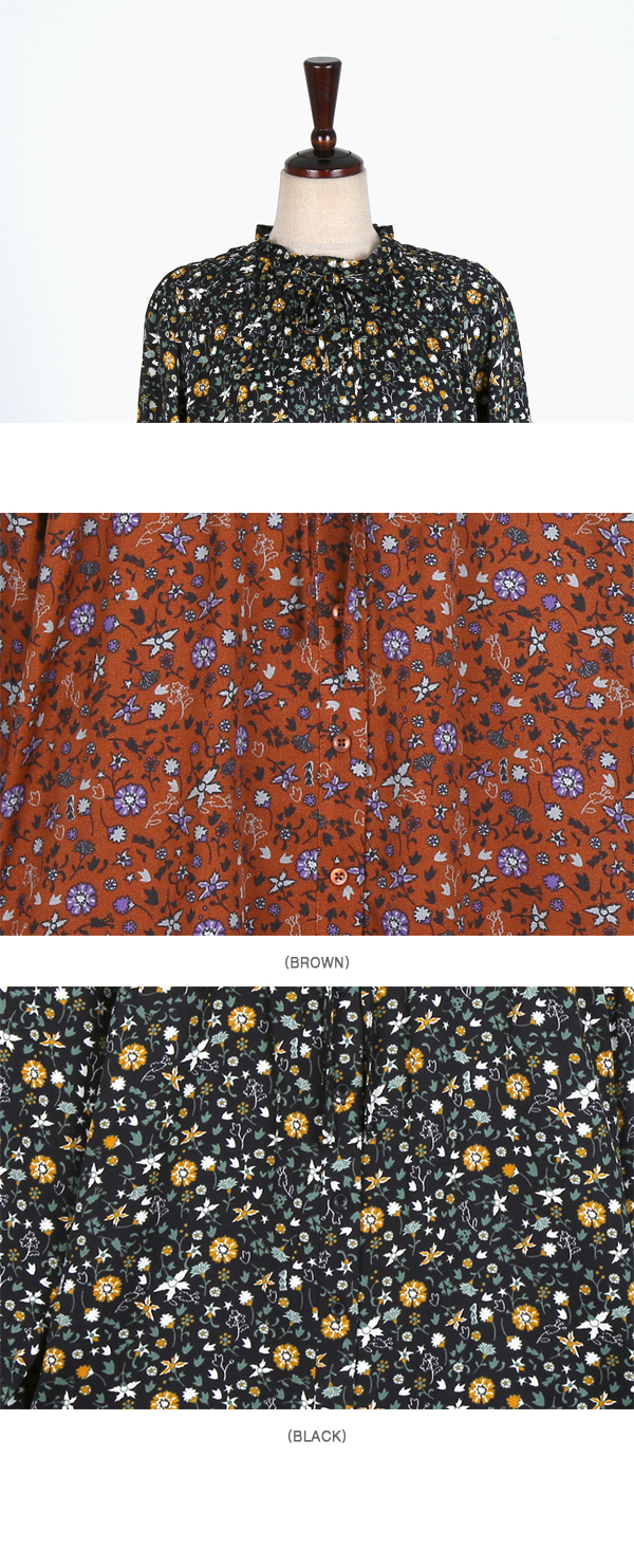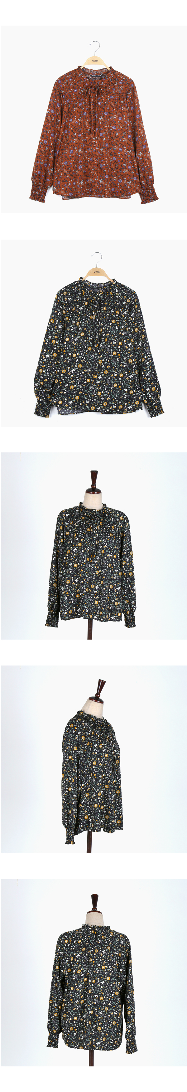 - 플라워 패턴이 돋보이는 여성스러운 하이넥 블라우스입니다.