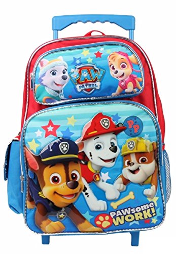 -. Brand : Paw Patrol -. Color : BLUE -. Department : boys -. EAN : 0875598686734 -. Feature : Measures around : 16"H x 12"W x 5"D / Two Front pockets with zipper closure / Two side meshed pockets / Adjustable padded shoulder straps -. Model : 06007 -. PackageQuantity : 2 -. ProductGroup : Apparel -. ProductTypeName : LAGE -. Size : large -. Title : New Paw Patrol SOME WORK! 16 Inches Large Rolling Backpack -. UPC : 875598686734