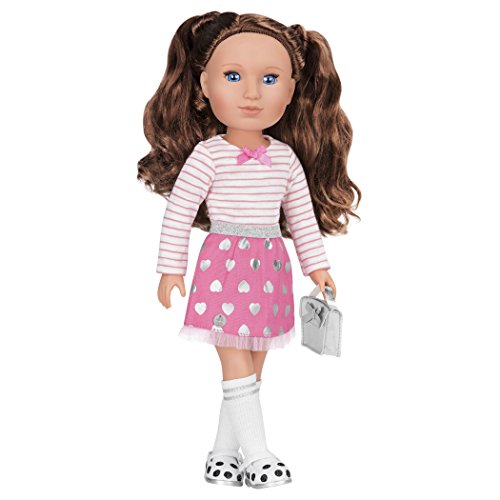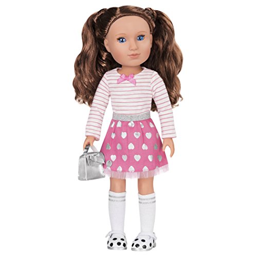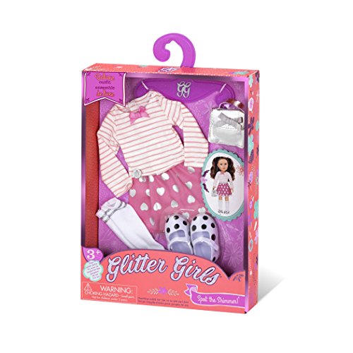 -. Binding : Toy -. Brand : Glitter Girls by Battat -. EAN : 0062243336872 -. Feature : This stylish outfit comes with a stripped long sleeve top with a pink skirt with sliver hearts, a cute silver purse, a pair of socks and of course a pair of shoes with glittery polka dots. / The adorable doll wearing this outfit is Bluebelle (not included) / Compatible with most 14" dolls including Wellie Wishers / 14" doll outfit / Recommended age 3+ -. Label : Branford LTD -. Manufacturer : Branford LTD -. Model : GG50011Z -. MPN : GG50011Z -. NumberOfItems : 1 -. PackageQuantity : 1 -. PartNumber : GG50011Z -. ProductGroup : Toy -. ProductTypeName : TOYS_AND_GAMES -. Publisher : Branford LTD -. ReleaseDate : 2017-09-29 -. Studio : Branford LTD -. Title : Glitter Girls Deluxe Skirt & Top Outfit -. UPC : 062243336872 -. Warranty : No Warranty