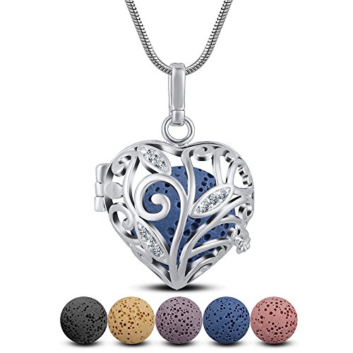 Lava Stone Aromatherapy Essential Oil Diffuser Necklace Heart Locket Tree of Life Crystals Pendant and 6 Different Natural Rock Beads Perfume Scent Jewelry with 24" Chain Silver Plated