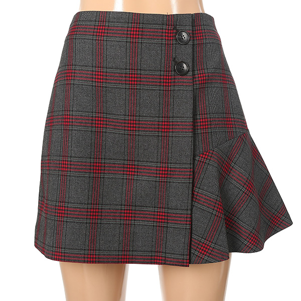 레드 컬러에 체크 패턴과 단추장식으로 포인트를 준 미니 스커트 입니다. A 라인으로 슬림한 레그라인을 연출해주며 여성스러운 페미닌함이 돋보이는 아이템 입니다.