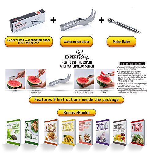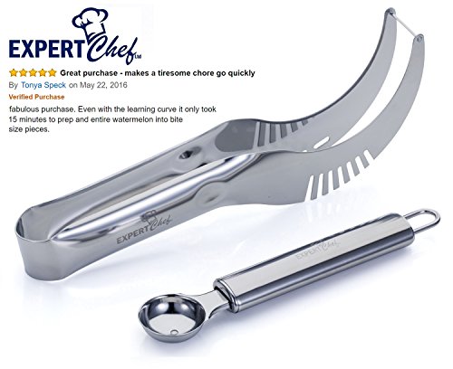 ? MULTI-USE - The Expert Chef Watermelon Slicer can be used on watermelons, honeydew, melons and cantaloupe melon. ?NEW STATE OF THE ART DESIGN : Easy to use and watermelon serve scooper tongs Stainless Steel Slicer and Bowl. Dishwasher safe, .The watermelon slicer is the perfect gifts for family, friends, co-workers, and just about anyone else you can think of. ?CHILD-FRIENDLY Rounded edges makes the slicer safe for kids.Get all out of your watermelon with this cute slicer.