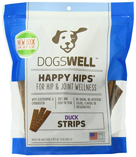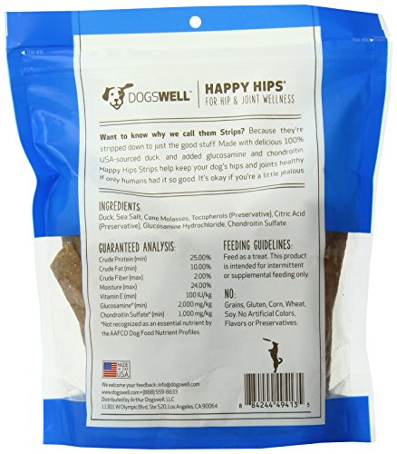 Made with delicious 100% USA-sourced duck, and added Glucosamine and Chondroitin, Happy Hips Strips help keep your dog's hips and joints healthy.Dog Weight Treats Per Day 5 - 20 lbs 1 - 2 21 - 80 lbs 1 - 3 81+ lbs 1 - 4 These treats should not be used as a replacement for a complete and balanced diet. Break into small pieces for small dogs. For the safety of your pets, you should always provide plenty of fresh water and observe your pets while they consume treats and chews.Dog Weight Treats Per Day 5 - 20 lbs 1 - 2 21 - 80 lbs 1 - 3 81+ lbs 1 - 4 These treats should not be used as a replacement for a complete and balanced diet. Break into small pieces for small dogs. For the safety of your pets, you should always provide plenty of fresh water and observe your pets while they consume treats and chews.Lamb, Salt, Cane Molasses, Citric Acid (Preservative), Chondroitin Sulfate, Glucosamine Hydrochloride, Mixed Tocopherols (Preservative), Rosemary Extract.Duck, Salt, Cane Molasses, Citric Acid (Preservative), Chondroitin Sulfate, Glucosamine Hydrochloride, Mixed Tocopherols (Preservative), Rosemary Extract.Feature