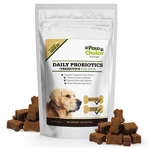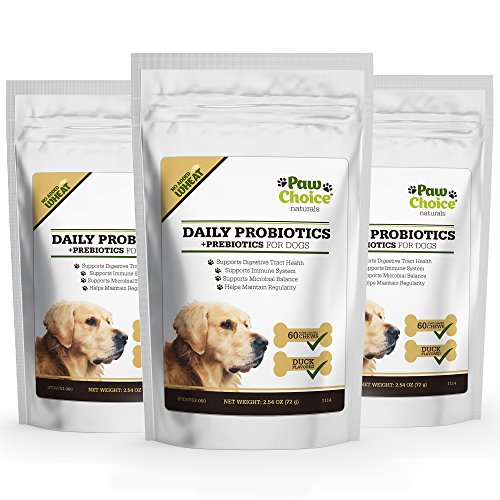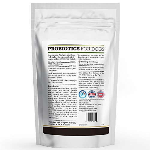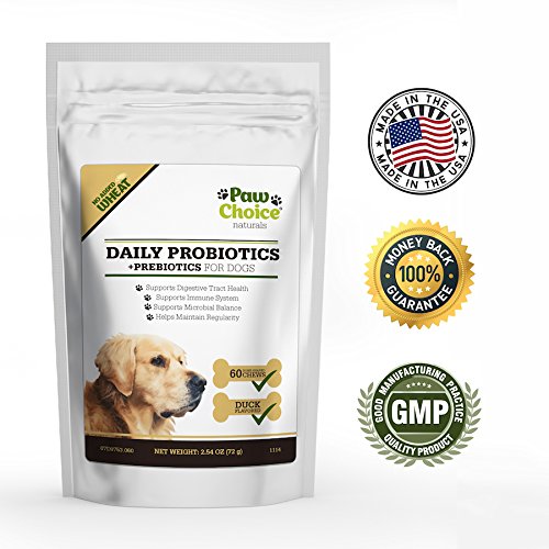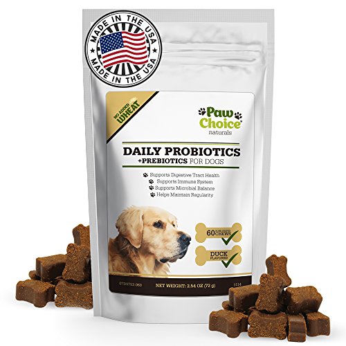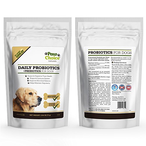 -. Feature : UNBEATABLE PREMIUM QUALITY STANDARDS. Manufactured in the USA in a certified Good Manufacturing Processes (cGMP) facility. All ingredients are required to have a Certificate of Analysis before delivery and are tested again upon receipt in our facility to ensure potency and safety. Our facility is regularly audited by the National Animal Supplement Council (NASC) and passes every inspection. / A SUPPLEMENT YOUR DOG WILL LOVE. Our duck flavored soft chews taste so good your dog will think of them as a treat. Easy to feed and bite-sized, it creates a positive bonding experience while giving them something beneficial to their health. / SUPPORTS MICROBIAL BALANCE FOR OPTIMUM HEALTH. Our patented probiotic strain has been clinically researched for effectiveness. Use daily to maintain a healthy GI tract, improve digestion, support the immune system and enhance overall health. Also provides extra support during stressful situations like traveling, kenneling, training, during bowel movement issues like diarrhea and during or after taking antibiotics. / PRODUCES DIGESTIVE ENZYMES for optimum nutrient absorption. Contains no wheat, no corn and no artificial ingredients. Good for sensitive stomachs and dogs of all sizes. / SATISFACTION GUARANTEED. When you order today, you're protected by a 30 day, no questions asked satisfaction guarantee and world class customer service!