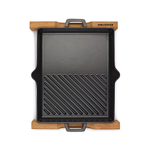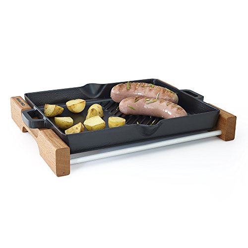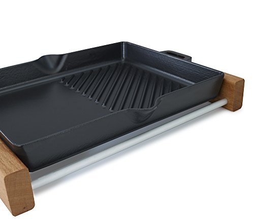 This hybrid grill pan features both a ridged and a flat cooking surface for cooking meats and vegetables, or sandwiches side by side, allowing the fat to drain away and be poured off through spouts on either side. Four layers of exterior enamel provide the slow, even heat that is the hallmark of cast iron while also being highly resistant to cracking and chipping. The smooth durable enamel interior won't rust, never needs seasoning, and makes food release a snap. The wooden tray provides "oven-to-table" convenience, keeping the food hot and sizzling when brought to the table.