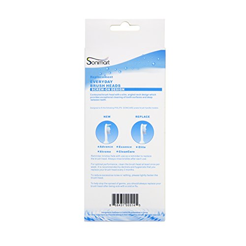 - Feature : Sonimart sensitive toothbrush heads with ultra soft britles are gentle on teeth and gums / Screw-on system fits: Advance, CleanCare, Elite, Essence and Xtreme Philips Brush Handles / The quality of Sonimart Premium toothbrush heads is the MOST comparable to Philips Sonicare / OEHHA Prop 65 approved Sonimart toothbrush heads are made at the highest health and safety standard / Reminder bristles will fade when a replacement is needed, usually three months