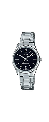 Brand, Seller, or Collection Name:Casio Model number:LTP-V005G-1B Part Number:LTP-V005D-1B Item Shape:Round Dial window material type:Mineral Display Type:Analog Clasp:Fold-over-clasp Case material:Stainless steel Case diameter:28 millimeters Case Thickness:7.5 millimeters Band Material:Stainless steel Band length:Women's Standard Band width:14 millimeters Band Color:Silver Dial color:Black Special features:N/A Item weight:2.2 Pounds Movement:Japanese quartz Water resistant depth:30 Meters