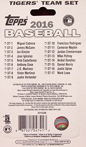 [Product Information]- This is a 2016 Topps Detroit Tigers Factory sealed special edition 17 card team set; cards are numbered DT-1 through DT-17 and are not available in packs. Players included are Miguel Cabrera, James McCann, Ian Kinsler, Jose Iglesias, Nick Castellanos, Anthony Gose, J.D. Martinez, Victor Martinez, Justin Verlander, Francisco Rodriguez, Cameron Maybin, Jordan Zimmermann, Mike Pelfrey, Anibal Sanchez, Daniel Norris, Justin Upton and Mark Lowe.