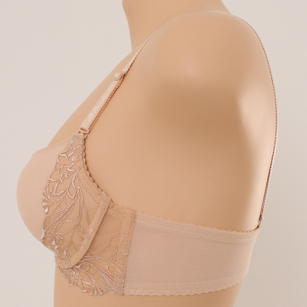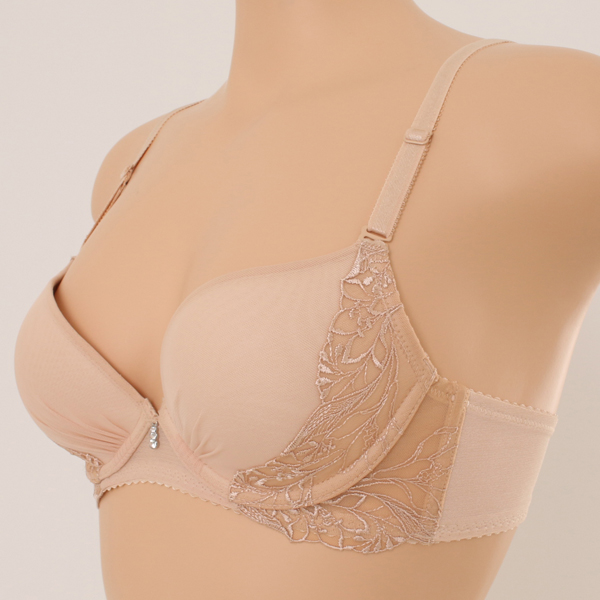 저중심 타입의 풀컵 몰드 사용으로 가슴의 볼륨을 살려주고 중심쪽으로 넓은 주름과