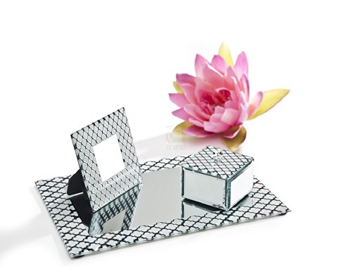 - Multi-use set includes a picture frame and jewelry box atop a 10-inch mirrored glass tray
