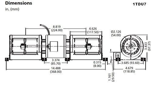 • Agency Compliance: UL Recognized US and Canada (E47479), CE Motor Enclosure: Open Conduit Box: No Item: OEM Blower CFM @ 1.200-In. SP: - CFM @ 2.000-In. SP: - CFM @ 1.600-In. SP: - Overall Depth: 3-5/8" Voltage: 115 Outlet Width: 4-9/16" RPM: 3200 Outlet Height: 1-1/16" Overall Width: 14-5/8" Inlet Dia.: 2-1/8" Overall Height: 3-7/8" Wheel Dia.: 2-1/2" Dimension B: 3-7/8"