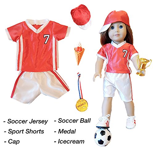 Sports Outfit Set: Soccer Jersey, Sport Shorts, Cap, Soccer Ball, Medal, Ice Cream Treats.