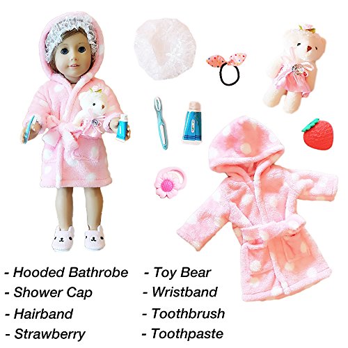 Bath Outfit Set: Hooded Bathrobe, Shower Cap, Hairband, Strawberry, Toy Bear, Wristband, Toothbrush and Toothpaste.