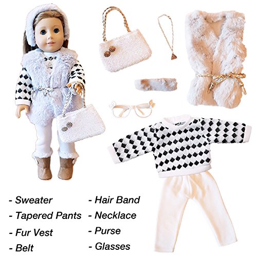 Winter Outfit Set: Sweater, Tapered Pants, Fur Vest, Belt, Hairband, Necklace, Handbag and Glasses.