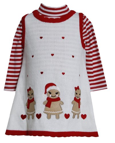 -. Feature : Delightful jumper dress set from Bonnie Baby (line from Bonnie Jean). / The jumper features ivory knitted fabric throughout, red trims at neckline / arms / hem, pom-pom 'dangling' below center neckline, and girls gingerbread with heart appliques at bottom. Comes with a red / white stripe long sleeve shirt with snap bottom closure. / Jumper is 100% acryllic and onesie shirt is 60% cotton & 40% polyester.