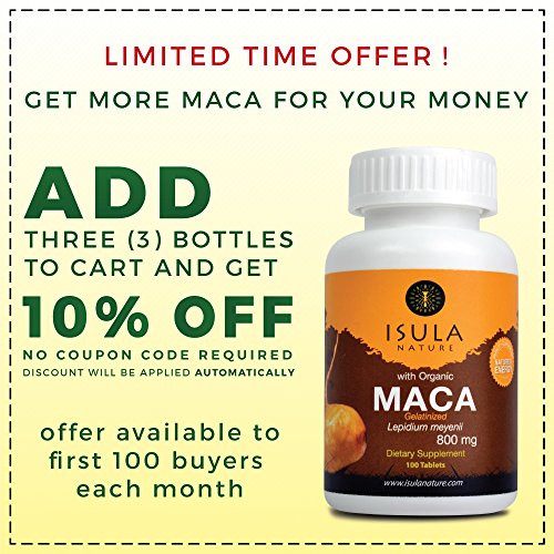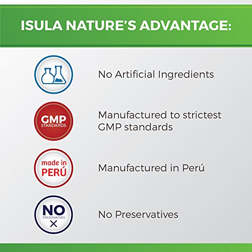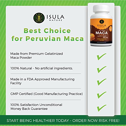 -. Binding : Health and Beauty -. Brand : Isula Nature -. EAN : 7750215000076 -. Feature : 800mg, More Maca on each Tablet! - Maca Root Premium Gelatinized Powder, raw maca has been associated with stomach discomfort; gelatinization is a simple process which makes maca very easy to digest and improves absorption. / Peruvian Maca also known as Peruvian Gingseng; has been used for centuries by the ancient peruvian culture to promote energy, stamina, endurance and overall health in men and women. It is a nutritious source of essential amino acids, fatty acids, vitamins and minerals. / Maca widely recognized as an adaptogen and hormone balancing substance, therefore a natural alternative to eliminate menopause simp, improve fertility and sex mood in both genders as well as brain function. / Maca Tablets Isula Nature is GMP certified and with 100% natural smell, flavor and color It is easy to ingest and portable, so that you can take it everywhere and enjoy the full Maca benefits. / Isula Nature 100% Satisfaction Guarantee: get a full refund within 30 days if you are not completely satisfied. -. IsAdultProduct : 0 -. Label : Isula Nature Inc -. LegalDisclaimer : - do not use it if imprinted seal is broken or missing - not recommended for pregnant or nursing women - store at room temperature between 60 and 90 degrees - keep out of reach of children -. Manufacturer : Isula Nature Inc -. PackageQuantity : 100 -. ProductGroup : Health and Beauty -. ProductTypeName : HEALTH_PERSONAL_CARE -. Publisher : Isula Nature Inc -. Studio : Isula Nature Inc -. Title : ISULA NATURE Organic Gelatinized Maca Root 800mg x 100 tablets
