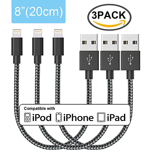 ONSON iPhone Cable,3Pack 8 Inch Short Nylon Braided iPhone Cord Lightning Cable Certified to USB Charging Charger for iPhone 7/7 Plus/6S/6S Plus,SE/5S/5,iPad,iPod Nano 7 (Black White,8 Inch)